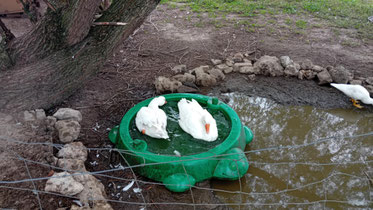 Les petites oies préfèrent le bac à la mare! On leur avait pourtant créer un nouvel espace...à suivre!